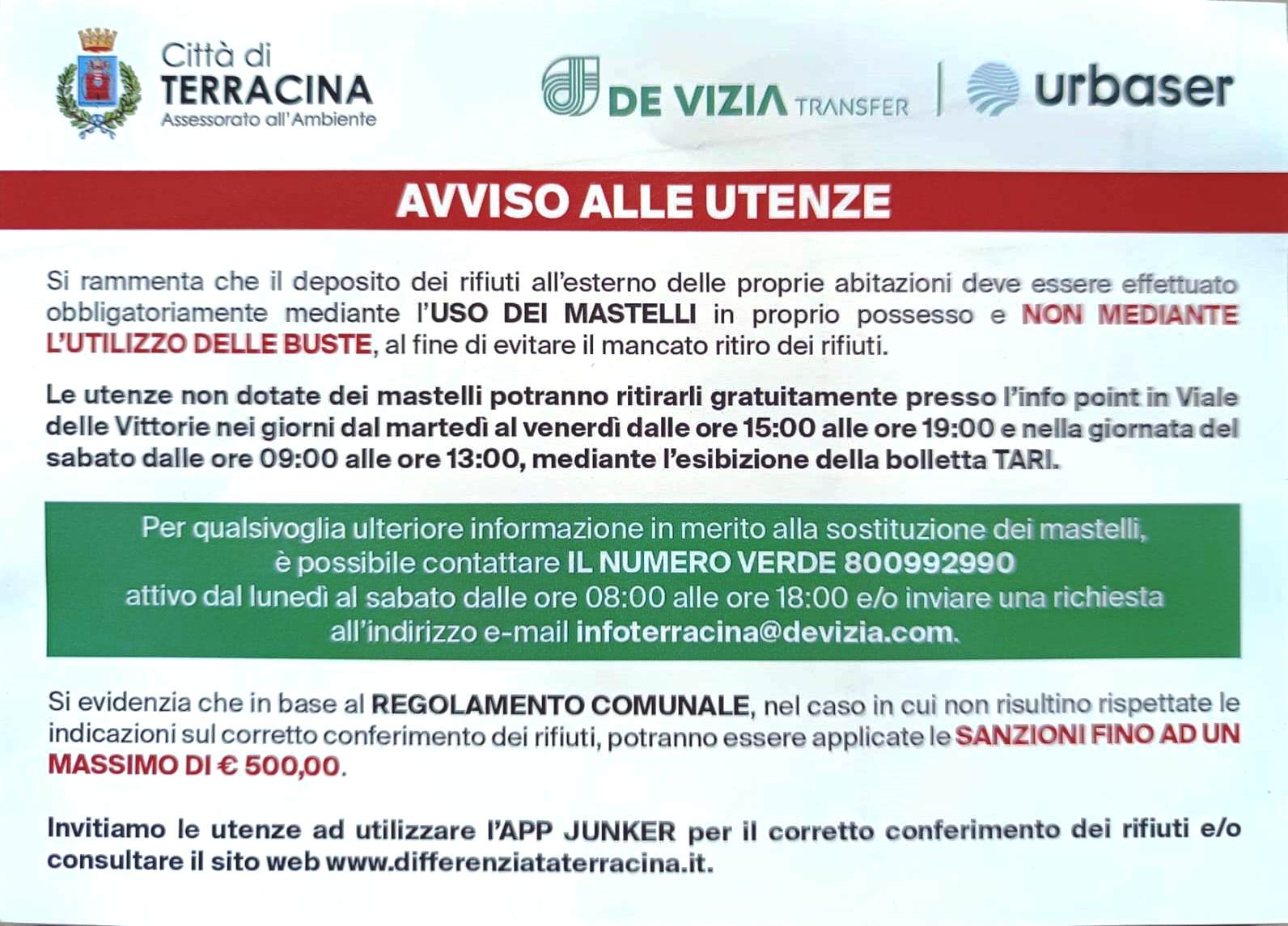 I cittadini che non riceveranno il kit per raccolta differenziata perché non trovati presso le loro abitazioni, potranno ritirarlo presso la Sede De Vizia – Urbaser, via Pontina Km 101/300, aperto dal lunedì al venerdì dalle ore 09.00 alle ore 13.00 e dalle 15:00 alle 18:00 e il sabato dalle ore 09.00 alle 13.00.